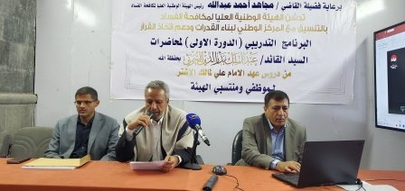 دشنت الهيئة الوطنية العليا لمكافحة الفساد بالتعاون مع المركز الوطني لبناء القدرات ودعم اتخاذ القرار، اليوم البرنامج التدريبي (الدورة الأولى) حول محاضرات قائد الثورة السيد عبدالملك بدر الدين الحوثي من دروس عهد الإمام علي لمالك الأشتر.