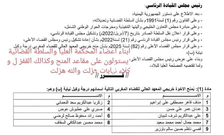 أثارت وثيقة رسمية متداولة لعام 2026 موجة واسعة من الجدل والانتقادات في الأوساط الحقوقية والقانونية، بعد أن أظهرت منح عدد من خريجي المعهد العالي للقضاء في المملكة المغربية درجة وكيل نيابة (ب) باسم الجمهورية اليمنية، وسط اتهامات بوجود محاباة واستحواذ أبناء مسؤولين نافذين على معظم هذه الفرص.