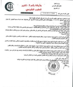 فقد أُجري التشريح بتاريخ 25 / 6 / 2025م، وشمل تشريح الرأس والعنق والصدر والبطن، مع التحفّظ على عدد من الأعضاء، من بينها القلب والمخ والكبد وجزء من الرئة، وذلك بناءً على طلب الشاكي نفسه.